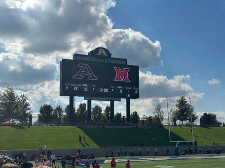 Purchased a $16 General Admission ticket on SeatGeek and sat 7th row at the 48-yard line on the Miami OH sideline since I bet Red Hawks -11. It was a beautiful, 65 degree and sunny afternoon in Ohio for an in-state MAC battle (though the schools are 4 hours apart).